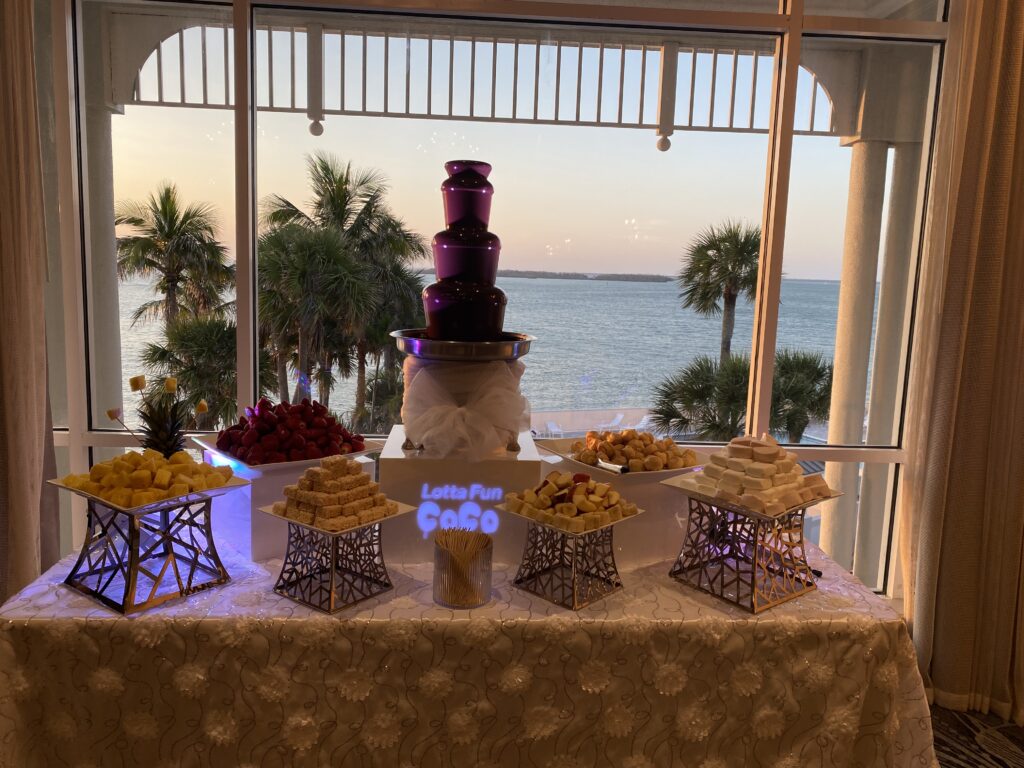 Chocolate fountain, Premium Belgium chocolate (milk, dark semi-sweet or white), 3 hours of flow time, table cloth, professional LED spot lights, choice of gold or silver stands with platters, skewers, plates and napkins and chocolate fountain attendant.